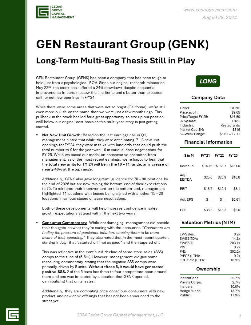 At the end of last month, GEN Restaurant Group (GENK) shared their Q2’24 earnings and we were quite happy with the financials and management commentary. For those of you who aren’t aware, we shared our initiating coverage on the name and highlighted our long position at the end of May.