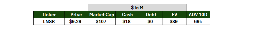 • LENSAR has recently inflected to breakeven Adj. EBITDA and positive FCF while having no debt and ~17% of its market cap in cash.